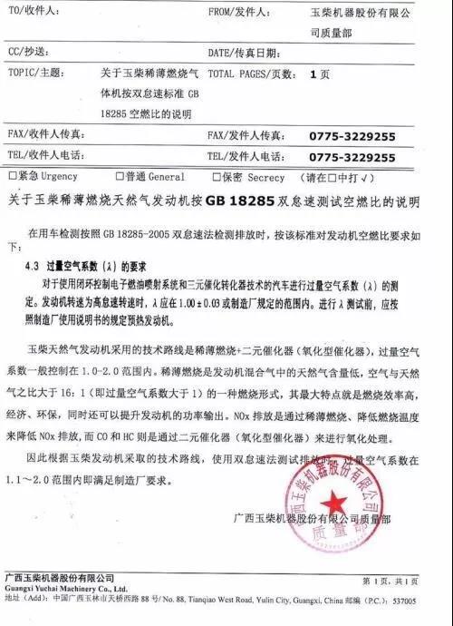2)在雙怠速方法檢測時,λ值可根據(jù)發(fā)動機制造廠出具的文件,按照發(fā)動機生產(chǎn)廠的限值進行評價,例:下圖是一家天然氣發(fā)動機生產(chǎn)廠家出具的λ限值證明文件。